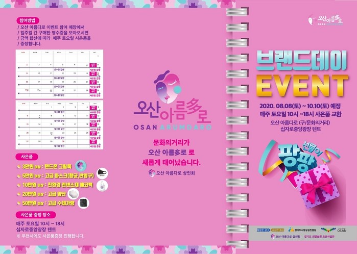 오산 아름다로 행사참여 매장에서 구매한 영수증의 합산 금액에 따라 특별히 제작한 수제가방, 양산, 에코백, 마스크 등의 경품을 증정한다.