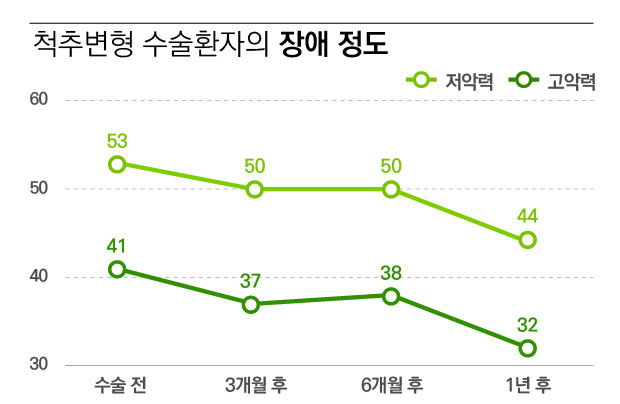 먼저 장애 정도 측면에서 고악력 환자들은 저악력 환자들보다 항상 낮은 수준을 유지하는 것으로 나타났다. 수술 전 저악력 환자들의 장애 점수가 53점일 때 고악력 그룹은 41점 수준으로 약 29% 낮았으며, 수술 1년이 지난 후에는 이 수치가 각각 44점과 32점으로 감소해 38%까지 벌어지는 결과를 보였다.