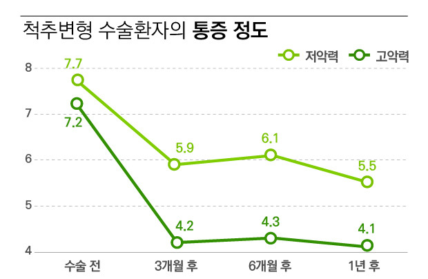 통증 개선에서도 차이가 있었다. 수술 전 두 환자군의 통증 정도는 7.7점(저악력)과 7.2점(고악력)으로 비슷한 수준이었으나, 수술 3개월 후 고악력 그룹에서의 증상 호전이 두드러져 4.2점으로 빠르게 감소했지만 저악력 그룹은 5.9점 수준에 머물러 비교적 수술에 따른 통증 완화 효과가 낮게 나타났다.