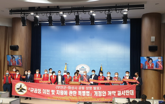 [로컬세계 고용주 기자]경기 화성시 국회의원 송옥주(갑), 이원욱(을) 및 전남 무안·영암·신안 국회의원 서삼석과 화성시의회 수원군공항화성이전반대 특별위원회(이하 화성시의회 군공항특위), 무안군의회 광주군공항무안이전반대 특별위원회(무안군의회 군공항특위), 수원전투비행장 화성이전 반대 범시민대책위원회(화성 범대위), 광주전투비행장 무안이전 반대 범군민대책위원회(무안 범대위), 화성시 새마을회‧통리장단협의회‧주민자치회‧경기남부수협어촌계장협의회‧화성환경운동연합 등은 8일 오전 11시 국회 소통관에서 ‘군공항 이전 및 지원에 관한 특별법 개정안’ 철회를 촉구하는 공동 성명서를 발표했다.
