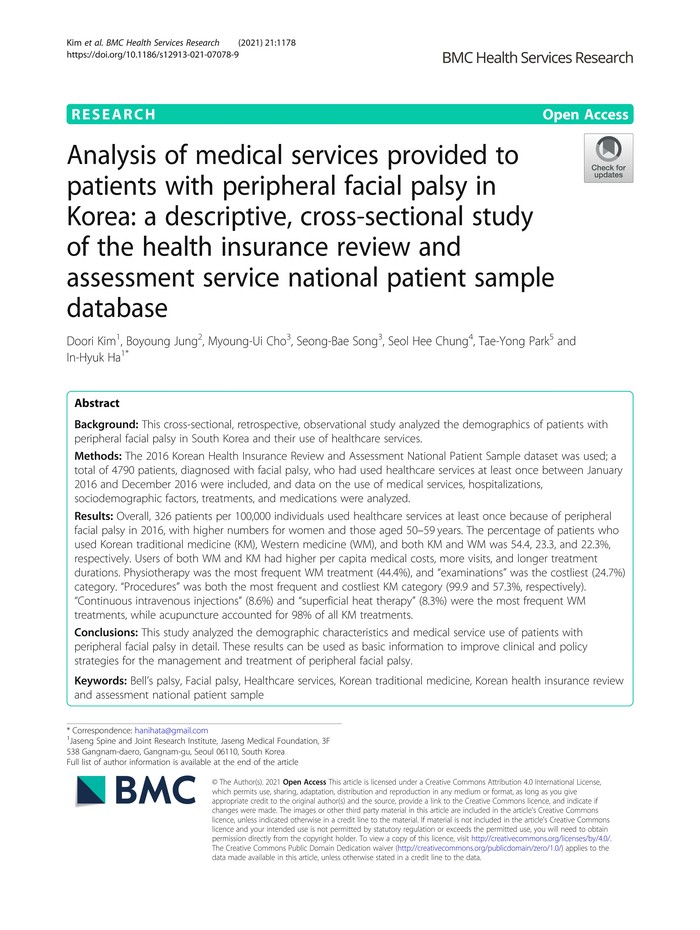 ▲[사진설명] ‘BMC Health Services Research’에 게재된 해당 연구 논문 「Analysis of medical services provided to patients with peripheral facial palsy in Korea: a descriptive, cross-sectional study of the Health Insurance Review and Assessment Service National Patient Sample database」 |