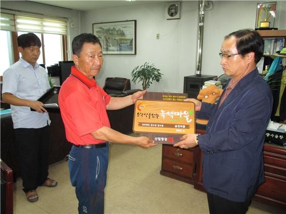 ▲장수 송천마을 관계자가 산불 없는 녹색마을 인증패를 받고 있다. |