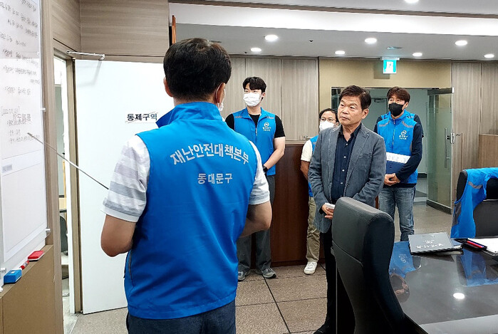 ▲이필형 동대문구청장이 1일 0시 동대문구 재난안전대책본부를 방문하여 호우 대비 상황을 점검하고 있다. 동대문구 제공 |