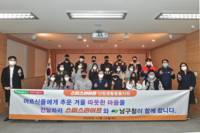 스미스라이프는 이날 남구청과 청년문제 및 후원활성화를 위한 간담회를 가진 후 어르신들의 따뜻한 겨울나기를 위해 극세사 이불, 라면, 롤 휴지로 구성된 생필품 22세트를 기탁했다.