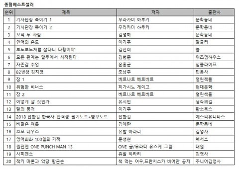 한편 이기주 작가의 ‘언어의 온도’는 지난주보다 한 계단 상승해 4위, 김신회 작가의 에세이 ‘보노보노처럼 살다니 다행이야’는 전주보다 일곱 계단 상승한 5위에 이름을 올렸다. 기분 좋은 커뮤니케이션을 만드는 사소한 말투에 관한 이야기를 담은 김범준 작가의 ‘모든 관계는 말투에서 시작된다’는 세 계단 올라 6위를 차지했다. ‘자존감 수업’은 세 계단 내려간 7위, 유시민 작가의 ‘어떻게 살 것인가’는 한 계단 하락한 12위를 차지해 다소 주춤했다. 이기주 작가의 ‘말의 품격’은 세 계단 하락한 13위에 머물렀다.