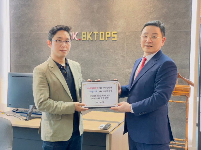 | ▲비케이탑스 정상용 대표(오른쪽)와 엔스펙 최우정 대표(왼쪽)가 메타버스 사업을 위한 업무협약을 체결한 뒤 기념촬영을 하고 있다. |