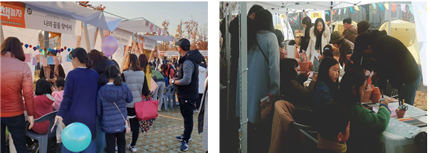 | ▲'제2회 도서관 책축제 “책놀자”' 좌)금파초등학교 북아트 융합교육연구회의 나의 미래 명함 만들기 체험 우)김경아 동화작가의 나의 마음정원 감정식물 컬러링 화분만들기 체험 |