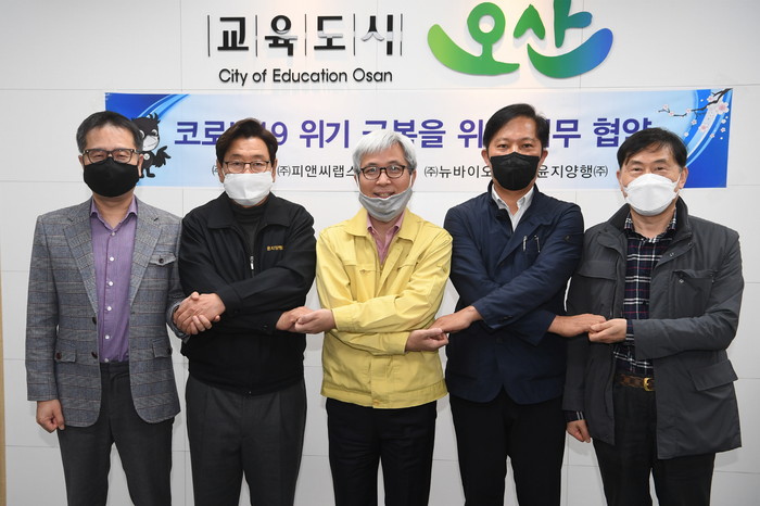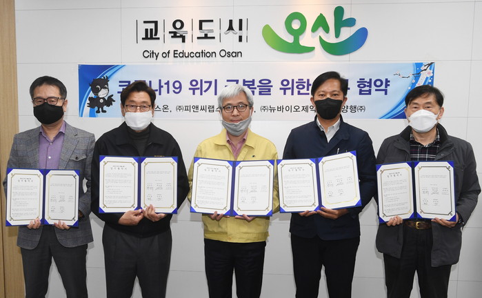 협약에 따라 시와 참여기업은 △생산제품에 대한 오산시 우선 공급 △방역 제품생산 및 공급 활동에 필요한 행정지원 △기타 상호협력을 위해 필요한 사항을 이행하기로 했다.
