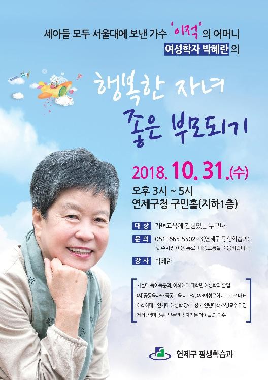 [로컬세계 맹화찬 기자]부산 연제구는 이달 31일 구청 구민홀에서 여성학자 박혜란 강사를 초청해 ‘행복한 자녀, 좋은 부모되기’ 특강을 진행한다고 29일 밝혔다.