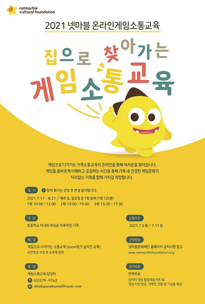 넷마블문화재단(이사장 방준혁)은 ‘2021 넷마블 온라인 게임소통교육’ 참가 가족을 모집한다고 5일 밝혔다.