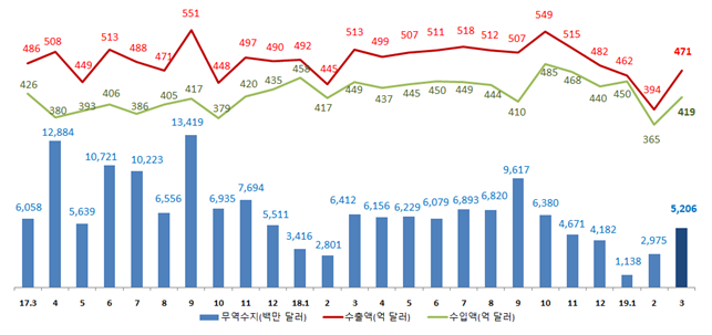 15일 관세청이 발표한 ‘3월 월간 수출입 현황(확정치)’에 따르면 지난달 수출이 전년 동월 대비 8.2% 감소한 471억달러로 집계됐다고 밝혔다. 무역수지는 52억달러 흑자로 2012년 2월부터 86개월 연속 흑자를 달성했다.
