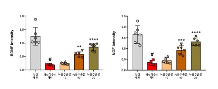 ▲과산화수소가 처리돼 손상이 유도된 신경세포에서 뇌유래신경영양인자(BDNF)와 신경성장인자(NGF)가 감소한 반면 녹용 추출물을 처리한 신경세포에서 농도에 따라 뇌유래신경인자와 신경성장인자의 발현이 다시 증가했다. |