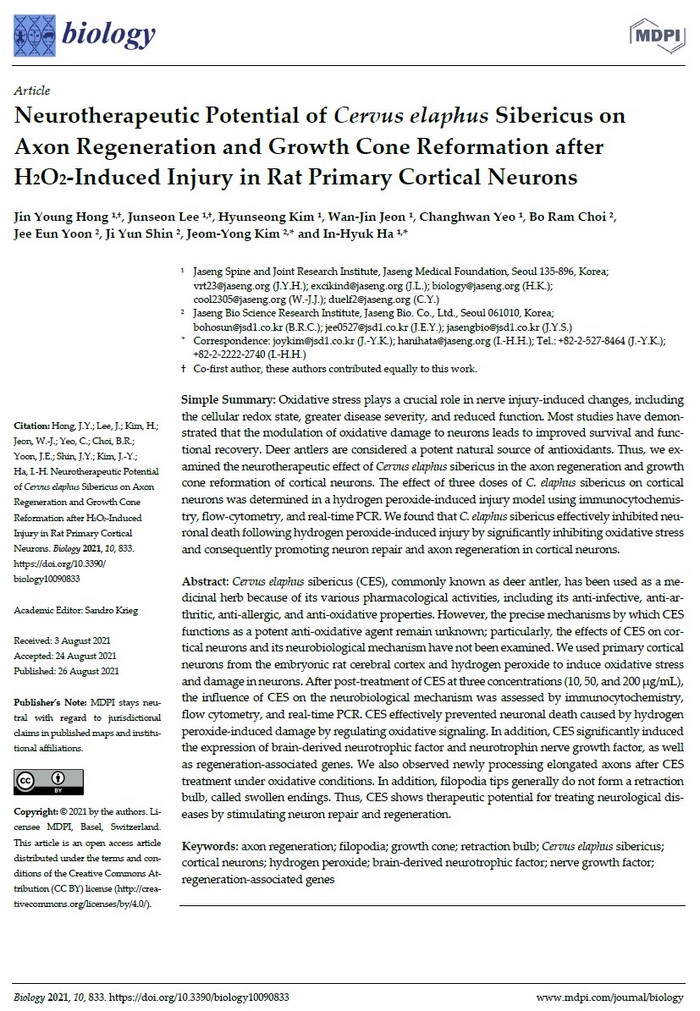 ▲SCI(E)급 국제학술지 ‘Biology’ 최신호에 게재된 해당 연구 논문 「Neurotherapeutic Potential of Cervus elaphus Sibericus on Axon Regeneration and Growth Cone Reformation after H2O2-Induced Injury in Rat Primary Cortical Neurons」 |