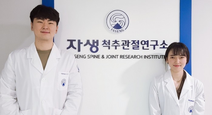 ▲논문 1저자로 참여한 자생척추관절연구소 홍진영 선임연구원(오른쪽)과 이준선 연구원 |