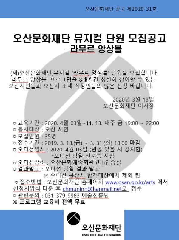 경기 오산문화재단은 이달 말까지 ‘라무르 앙상블’ 뮤지컬 단원을 35명을 모집한다고 13일 밝혔다.