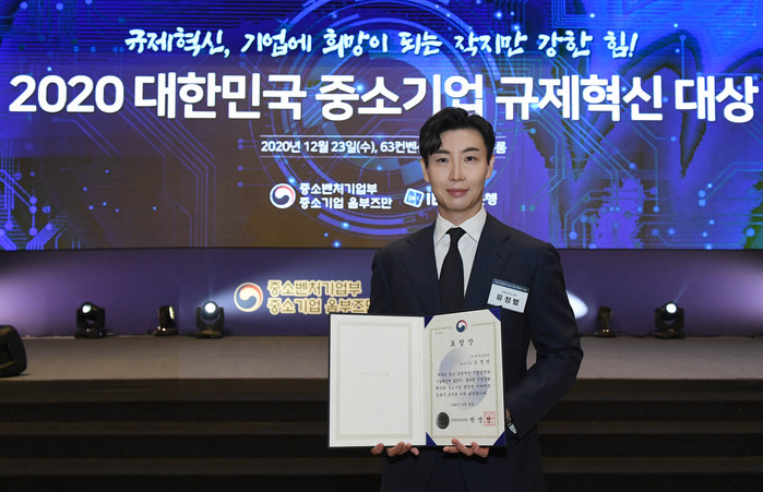 | ▲메쉬코리아 유정범 대표가 23일 중소벤처기업부(장관 박영선)에서 주최한 ‘2020년도 대한민국 중소기업 규제혁신 대상’에서 중소기업벤처부 장관상을 수상한 뒤 포즈를 취하고 있다. |