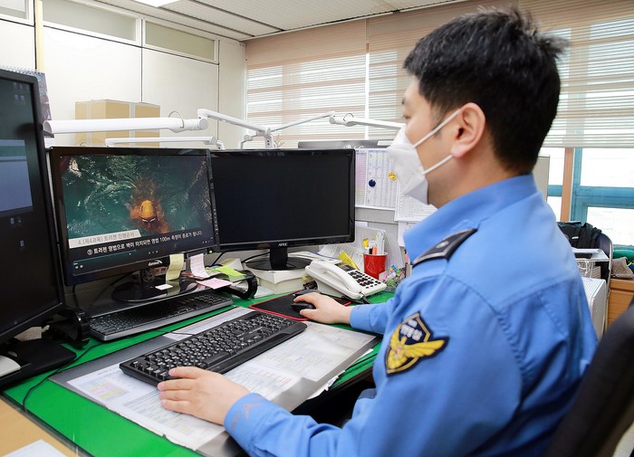 ▲남해해경청에서 전국 최초로 자체 제작한 수상구조사 국가자격시험 종사자 교육 동영상을 남해해경청 수색구조계 임진성 경위가 시청하고 있다.(남해지방해양경찰청 제공) |