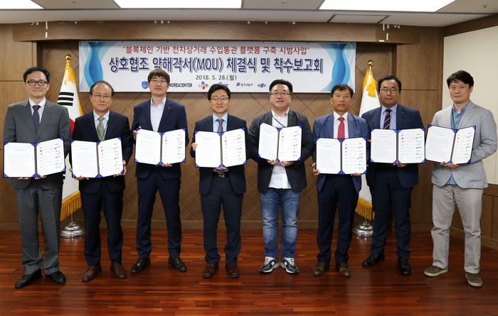 | ▲관세청은 28일 정부대전청사에서 전자상거래 블록체인 시범사업 업무협약 체결 후 기념촬영을 하고 있다.(관세청 제공) |