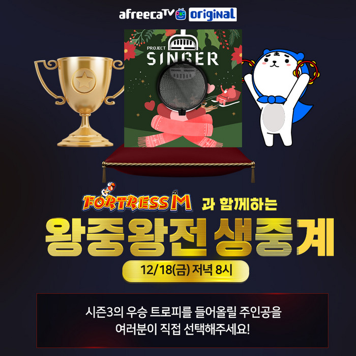 안승환 아프리카TV 엔터테인먼트사업팀 팀장은 “싱어프로젝트 시즌3는 국내 최정상의 제작자들이 참여해 유저들의 많은 기대와 관심을 받고 있다"며 "이번 시즌3 왕중왕전도 우승자들의 음원 발매 무대뿐만 아니라 뮤직 드라마, 작곡가 듀엣 콜라보 무대 등 다채로운 웰메이드 콘텐츠를 즐길 수 있으니 많은 사랑과 시청 부탁 드린다”라고 말했다. [로컬세계 조원익 기자]