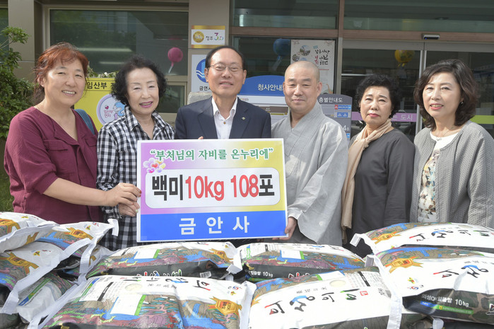 이날 금안사 주지 기정 스님, 후원회 이현숙 회장 등이 참석해 자비와 사랑을 베풀고자 백미를 기탁했다.