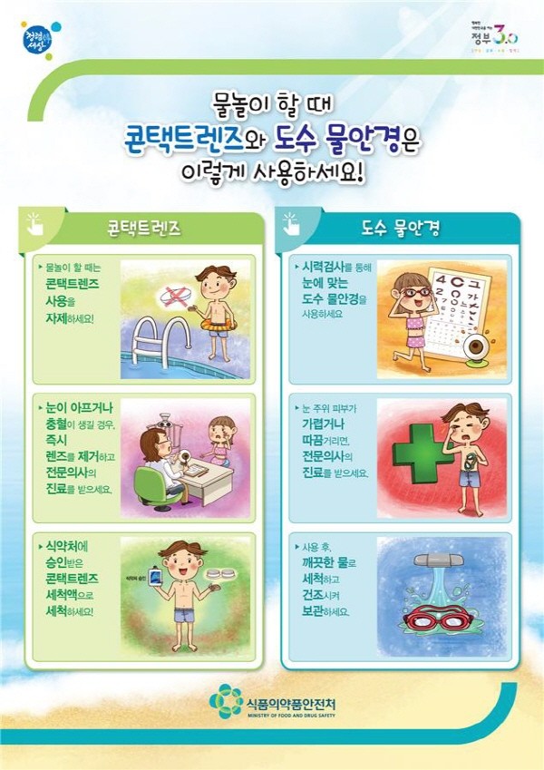 식약처는 “물놀이 시 콘택트렌즈와 도수 물안경의 올바른 사용 방법을 담은 리플릿을 제작·배포 한다”며, “국민들이 주의 사항을 숙지해 올 여름철 건강한 휴가가 되기를 바란다”고 전했다.