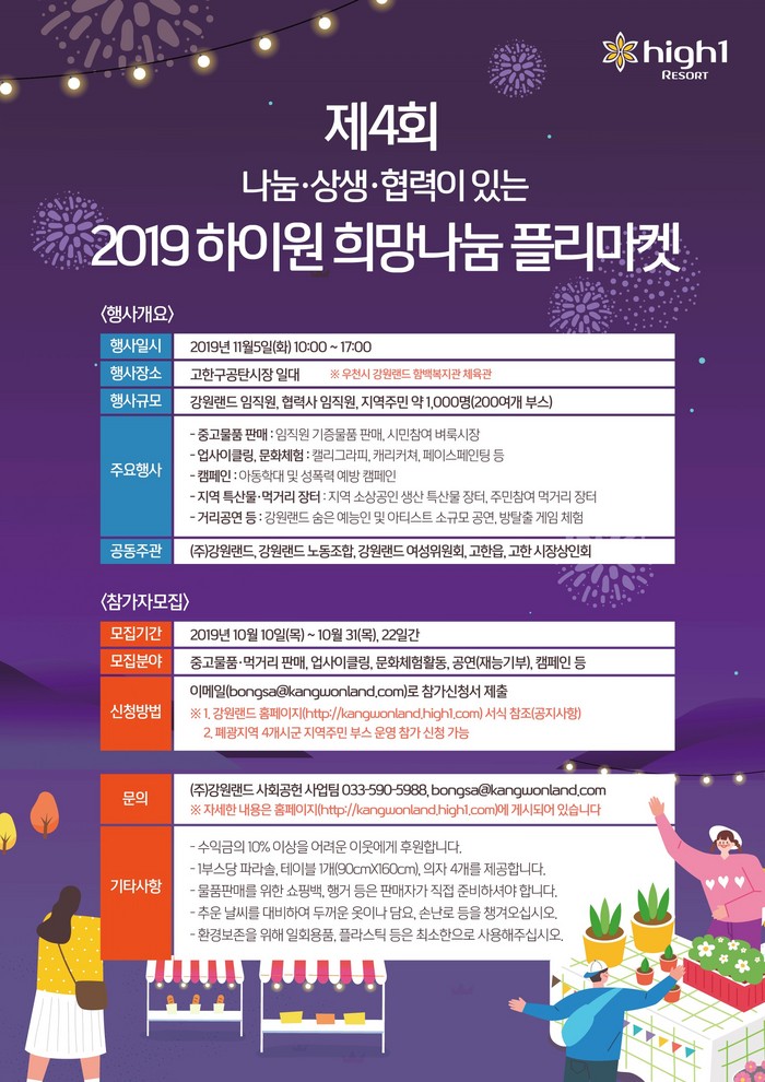 강원랜드 사회공헌사업팀 관계자는 “폐광지역의 상생과 협력을 위해 마련된 플리마켓인 만큼 많은 사람들이 참가해 따뜻한 온기를 나누는 시간이 됐으면 좋겠다”라고 밝혔다.