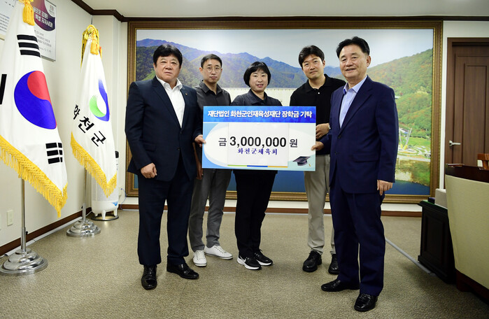 강원 화천군 체육회 송호관 회장(왼쪽 첫번째)과 사무처 임직원이 최문순 이사장(오른쪽)을 방문해 장학금 300만원을 기탁했다.(사진=화천군 제공)