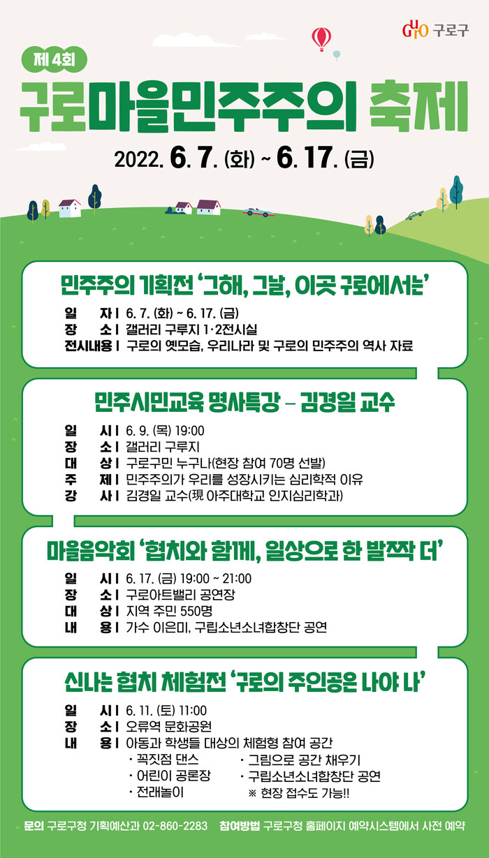 구로구 관계자는 “이번 축제를 통해 민주주의의 의미를 되새기는 기회가 되길 바란다”며 “민주항쟁을 기념하며 마련되는 행사인 만큼 많은 주민의 관심과 참여 바란다”고 전했다.