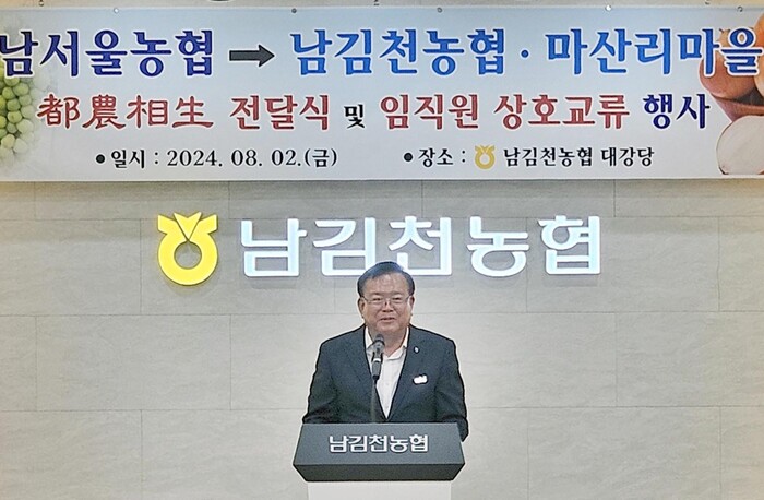 ▲남서울농협과 남김천농협, 김천 구성면 마산리마을 도농상생 전달식 및 상호교류행사가 지난2일 남김천농협 3층 대강당에서 진행되었다. 안용승 조합장이 인사말을 하고 있다. |