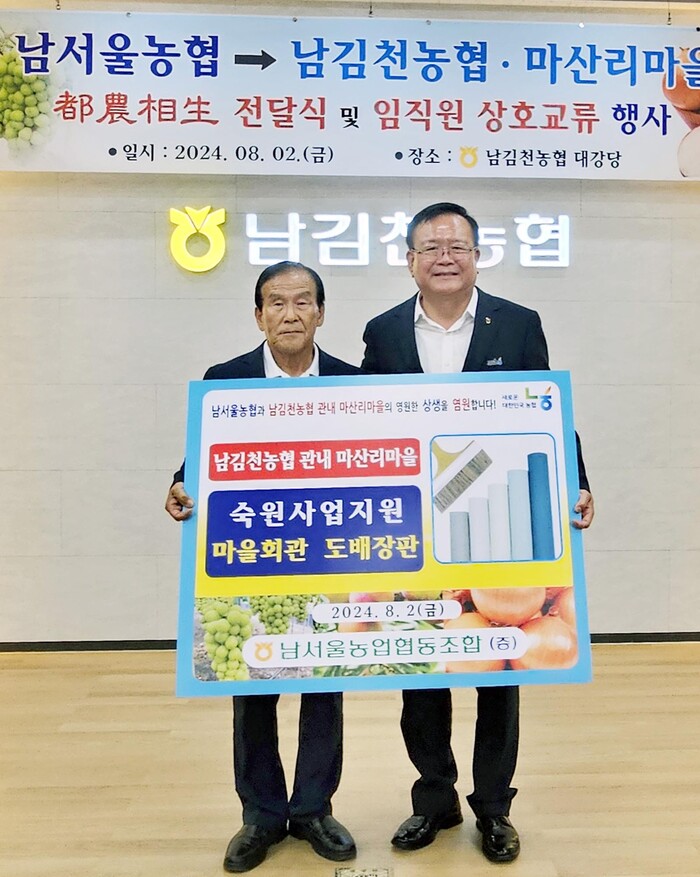 ▲남서울농협은 도농상생 실천사업의 일환으로 남김천농협에 무이자선급금(5억원)과 맞춤형영농자재지원(8백만원)를 지원하고, 2023년에 함께하는 마을로 연을 맺은 남김천농협 관내 구성면 마산리마을에는 숙원사업해결을 위하여 마을회관 도배, 장판, 식탁세트를 교체 지원하였다. 안용승 조합장(오른쪽) 구성면 마산리마을 이이택 이장(왼쪽) |