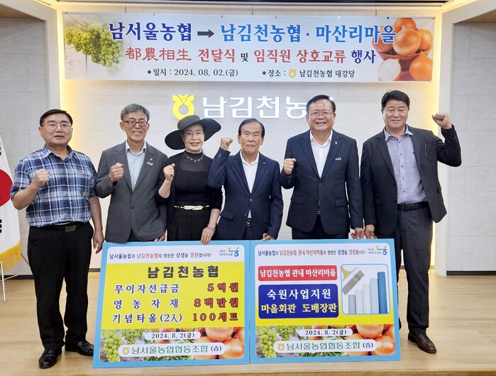 남서울농협(조합장 안용승)과 남김천농협(조합장 오세윤) 김천 구성면 마산리마을 도농상생 전달식 및 상호교류행사가 지난2일 남김천농협 3층 대강당에서 진행되었다.