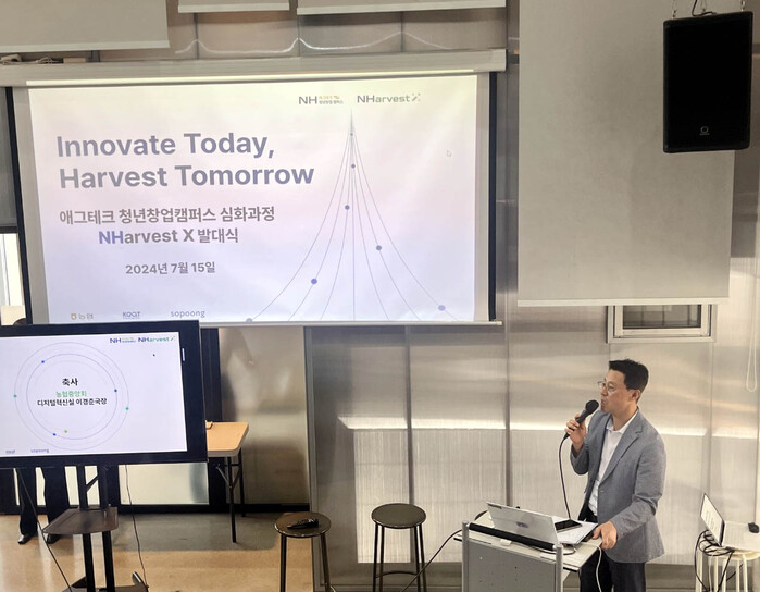 ▲2024년 농협 애그테크 청년창업켐퍼스 심화과정 발대식에서 농협중앙회 디지털혁신실 이경춘국장이 인사말을 하고 있다.농협 제공 |