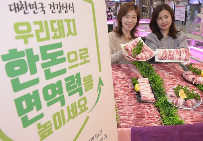 서울 서초구 농협유통 하나로마트 양재점에서 직원들이 삼겹살을 선보이고 있다. 농협유통은 3월 3일 ‘삼겹살데이’를 맞아 우리 축산 농가를 돕기 위해 양재·창동점 등 농협유통 하나로마트 전 점포에서 2월 28일(금)부터 3월 3일(화)까지 5일간 국내산 삼겹살을 파격 할인 판매한다.(사진=농협유통 제공)