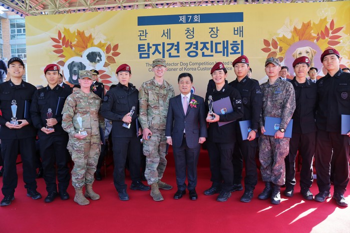 | ▲탐지견 경진대회에서 마약탐지분야에서 수상한 팀들과 기념촬영을 하는 이찬기(왼쪽 네번째) 인천세관장. |