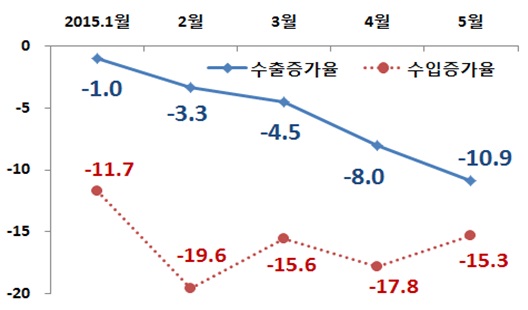 수출은 유가 등 수출단가 하락, 세계 교역 둔화 등 부정적 수철여건 지속과, 석가탄신일로 인한 조업일수 감소 영향 등으로 인해 올 들어 가장 큰 폭으로 감소했다.
