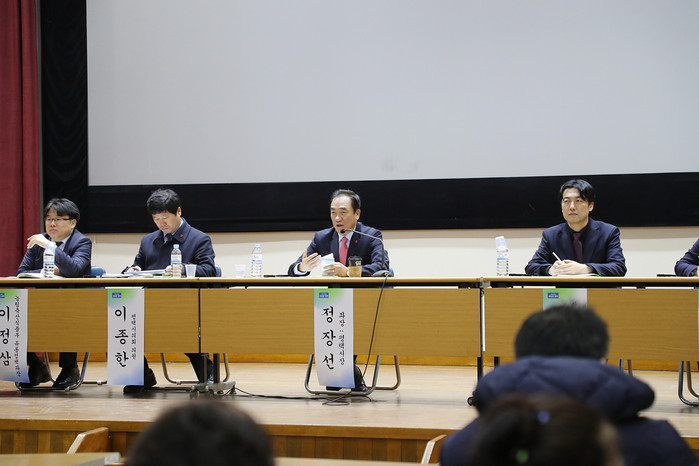 | ▲정장선 평택시장(가운데)이 지난 18일 시 농업기술센터에서 ‘평택농업 마케팅 전략을 위한 포럼’을 주관하고 있다.(평택시 제공) |