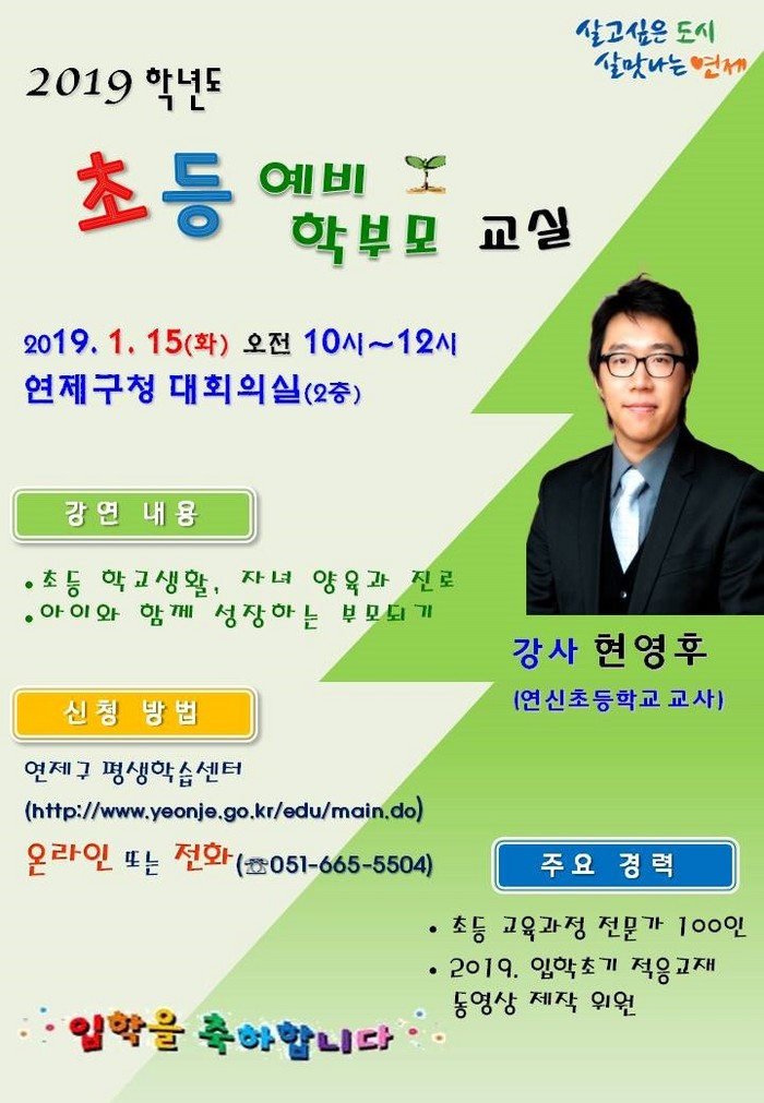 [로컬세계 맹화찬 기자]부산 연제구는 초등학교 입학을 앞둔 자녀를 가진 학부모들의 고민을 덜어주고자 ‘2019 초등 예비 학부모 교실‘을 개최한다고 11일 밝혔다.