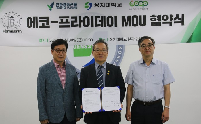 | ▲강용 친환경농산물의무자조금 관리위원장(왼쪽)은 30일 원주 상지대학교에서 정대화 상지대학교 총장(가운데), 공제욱 상지대학교 소비자생활협동조합 이사장과 ‘에코프라이데이’ 협약식을 진행했다.(친환경농산물자조금 제공) |