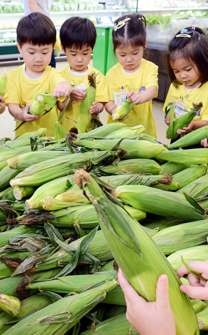 ▲11일 서울 서초구 하나로마트 양재점에서 견학 중인 분당 효자유치원 어린이들이 옥수수를 구경하고 있다. 농협유통 제공 |