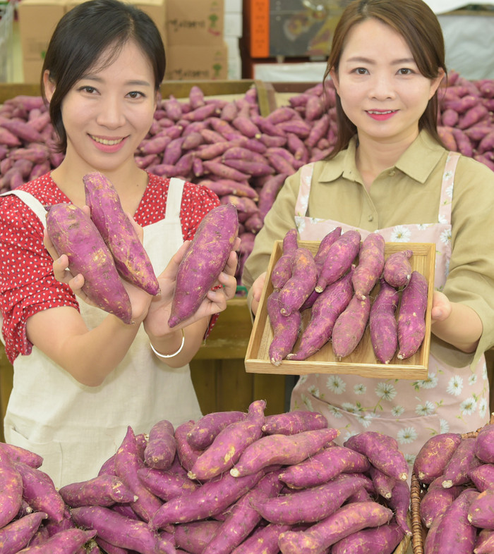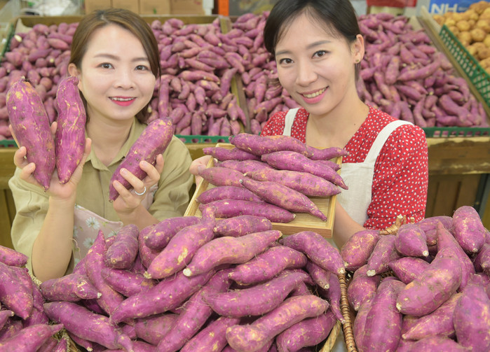 | ▲21일 서울 서초구 청계산로 농협 하나로마트 양재점에서 올해 첫 출하된 햇고구마를 직원들이 선보이고 있다.(농협유통 제공) |