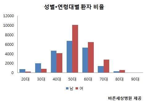 환자를 성별·연령별로 구분했을 때는 50~60대 비율이 61.8%(2만8591명)를 차지했고, 40대까지는 남성 환자의 비율이 높지만, 50대부터는 여성 환자의 비율이 높아지는 것으로 나타나 특히 중년 여성들이 어깨질환에 취약하다는 것을 확인할 수 있었다.