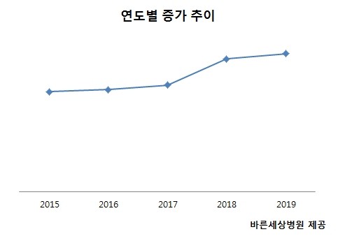 봄철이면 어깨 질환으로 병원을 찾는 이들이 늘어난다. 보건복지부 지정 관절전문병원인 바른세상병원(병원장 서동원)이 최근 5년(2015년~2019년)간 오십견(어깨 유착성 관절낭염)으로 내원한 환자 4만4726명을 조사한 결과, 지난 5년간 환자 수가 꾸준히 증가하고 있고 해마다 봄철 환절기인 3~5월에 특히 환자가 집중되는 것으로 나타났다.