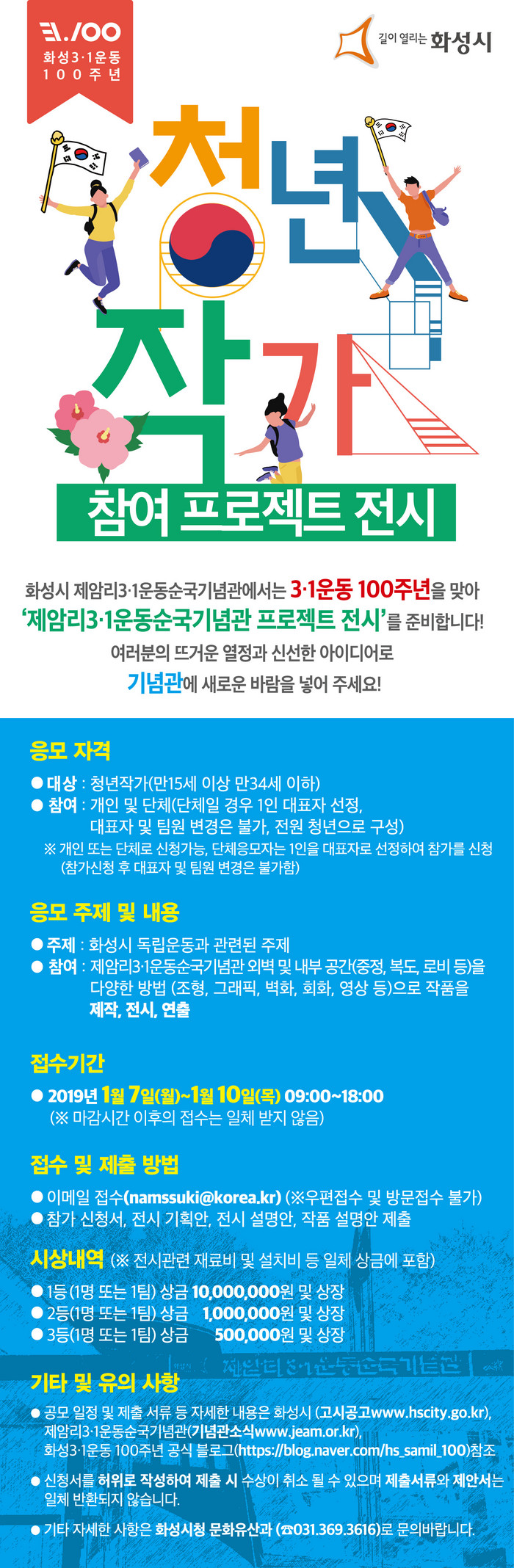 신청서는 화성시청 홈페이지 www.hscity.go.kr, 제암리3.1운동순국기념관 www.jeam.or.kr, 화성3.1운동 공식 블로그 https://blog.naver.com/hs_samil_100 다운받을 수 있다.