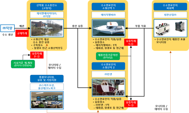 울산 ‘수소그린모빌리티 특구’는 2019년 11월 규제자유특구로 지정되어 수소연료전지가 탑재된 소형선박(2척)과 이를 충전하기 위한 선박용 수소충전소(1기)를 구축했다.