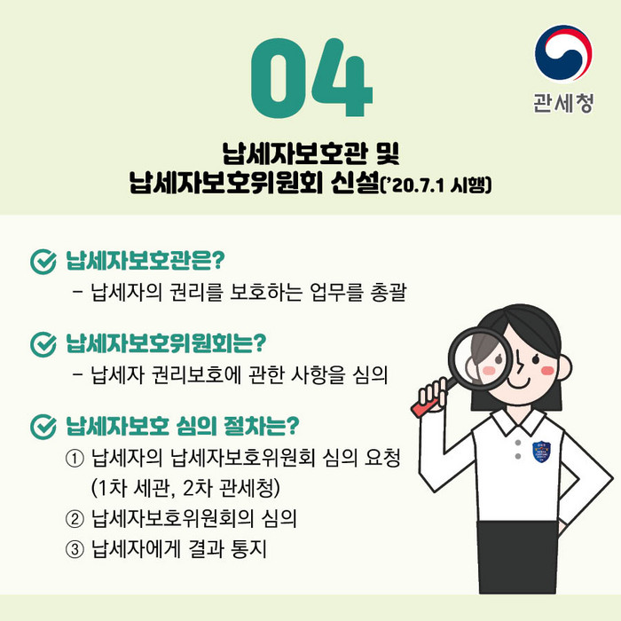 7월부터 납세자 권리보호 업무를 총괄하는 납세자보호관과 함께 납세자의 관세조사 중지 요청 등을 심의하는 납세자보호위원회를 신설해 심판청구·소송 이전 단계부터 납세자의 권리를 실효적으로 보호할 수 있을 것으로 기대된다.
