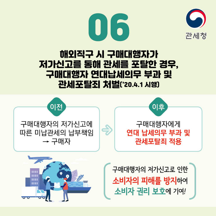 지금까지는 구매대행자의 저가신고에 따른 미납관세의 납부책임이  구매자에게만 있었으나, 앞으로 구매대행자에게 연대납세의무를 부과하고 구매대행자를 관세포탈죄로 처벌할 수 있도록 했다.