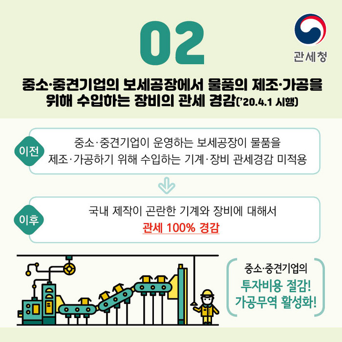 기존에는 중소·중견기업이 운영하는 보세공장이 물품을 제조·가공하기 위해 수입하는 기계와 장비는 관세 경감 대상이 아니었으나, 4월부터는 국내 제작이 곤란한 기계와 장비에 대하여 관세가 100% 경감된다.
