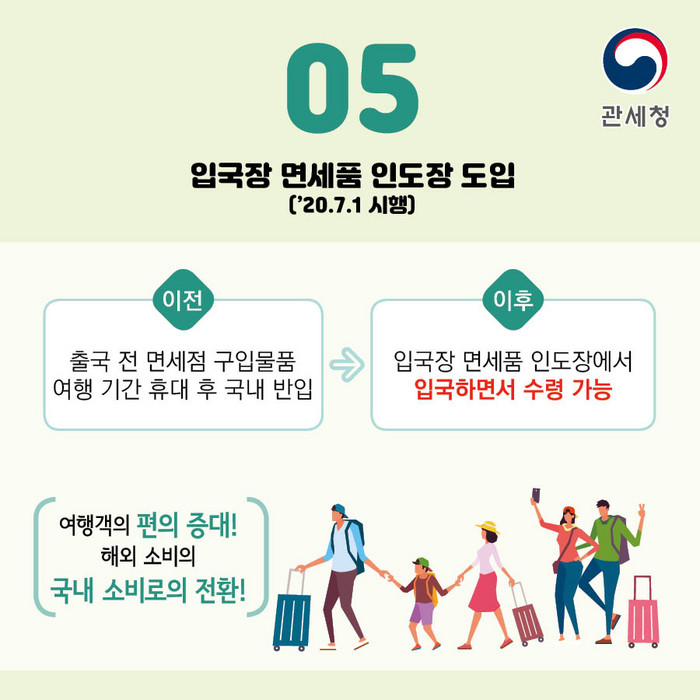 7월부터는 기존과 달리 면세점에서 구입한 물품을 입국장 내 면세품 인도장에서 찾을 수 있게 되어, 여행객의 편의 제고 및 해외 소비의 국내 소비로의 전환 효과가 기대된다.