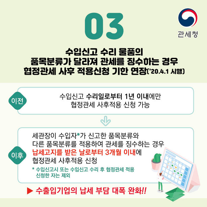 4월부터는 세관장이 수입자가 신고한 품목분류와 다른 품목분류를 적용해 관세를 징수하는 경우, 납세고지를 받은 날부터 3개월 이내에 협정관세의 사후적용을 신청할 수 있도록  했다.
