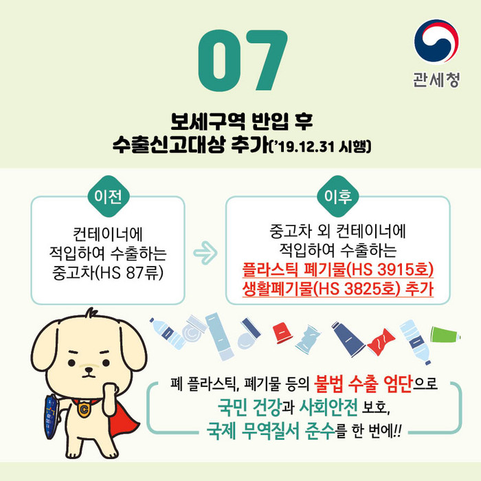 보세구역 반입 후 수출신고를 해야 하는 물품에 폐플라스틱·생활폐기물을 지정하여 폐기물 불법 수출을 사전에 차단한다.